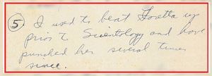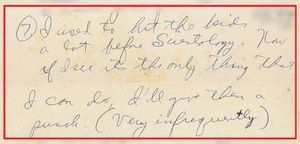 - On September 26, 1972, Ronald wrote, “I used to beat Loretta up prior to Scientology and have punched her several times since… I used to hit the kids a lot before Scientology. Now if I see it’s the only thing that I can do, I’ll give them a punch. (Very infrequently)” Click here to see the handwritten document.