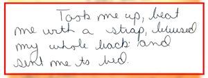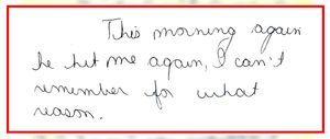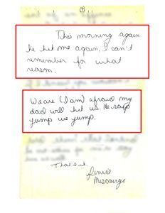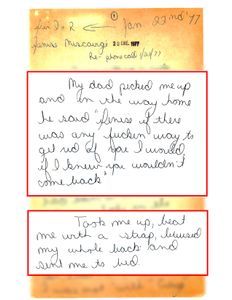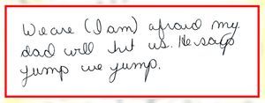- From one of his daughters, “My dad picked me up and on the way home he said ‘Denise if there was any f***en way to get rid of you I would if I knew you wouldn’t come back.’ Took me up, beat me with a strap, bruised my whole back and sent me to bed…This morning again he hit me again, I can’t remember for what reason… We are (I am) afraid my dad will hit us…” Click here to see the handwritten document.