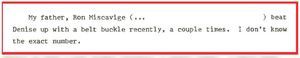 - From his eldest son Ronnie, Jr., “My father, Ron Miscavige […] beat Denise up with a belt buckle recently, a couple times. I don’t know the exact number… Loretta has told me that she thinks Ron is insane, and that he causes ‘bad scenes’ when friends of my sisters are around. She also told me that recently she was ready to call the police on Ron because of some scene. (I don’t know what.)” Click here to see the original document.