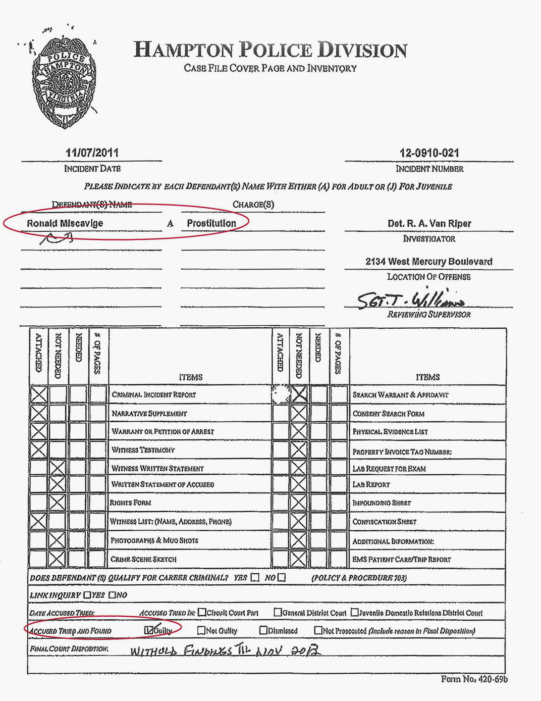 This is the Case File Cover Page and Inventory. It states Ronald Miscavige was charged with Prostitution. Accused Tried and Found Guilty. Final Court Disposition: Withhold Findings Til Nov 2012.