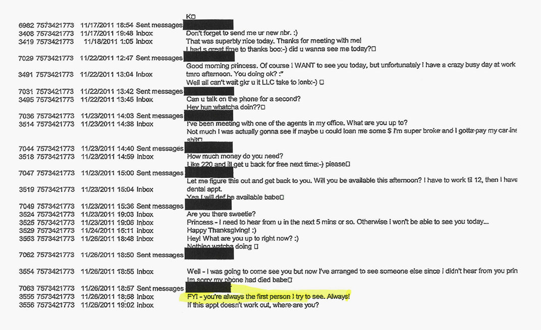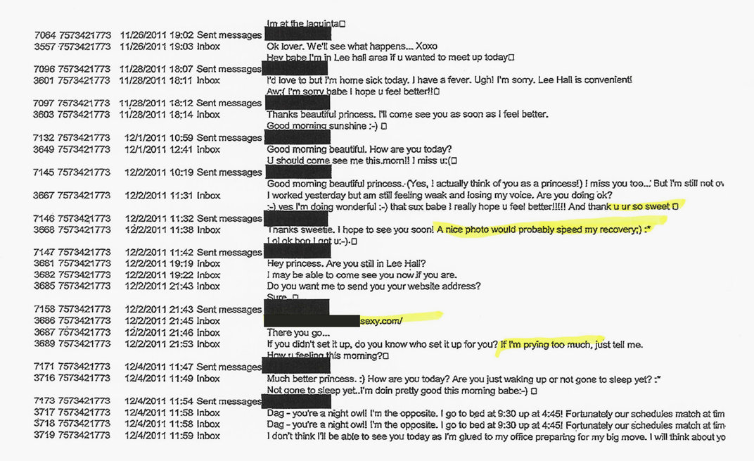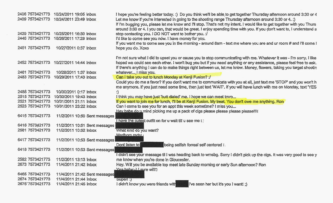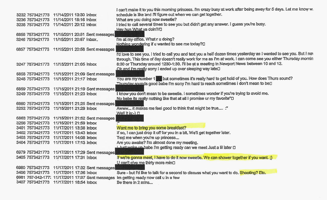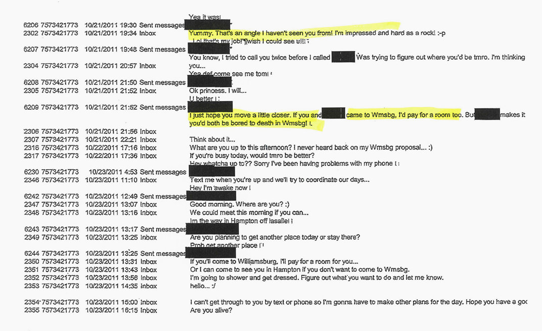 Note: According to the police report, the cell phone used for these texts is the same cell phone used to as a Manager of a Long & Foster real estate firm in Williamsburg, VA.