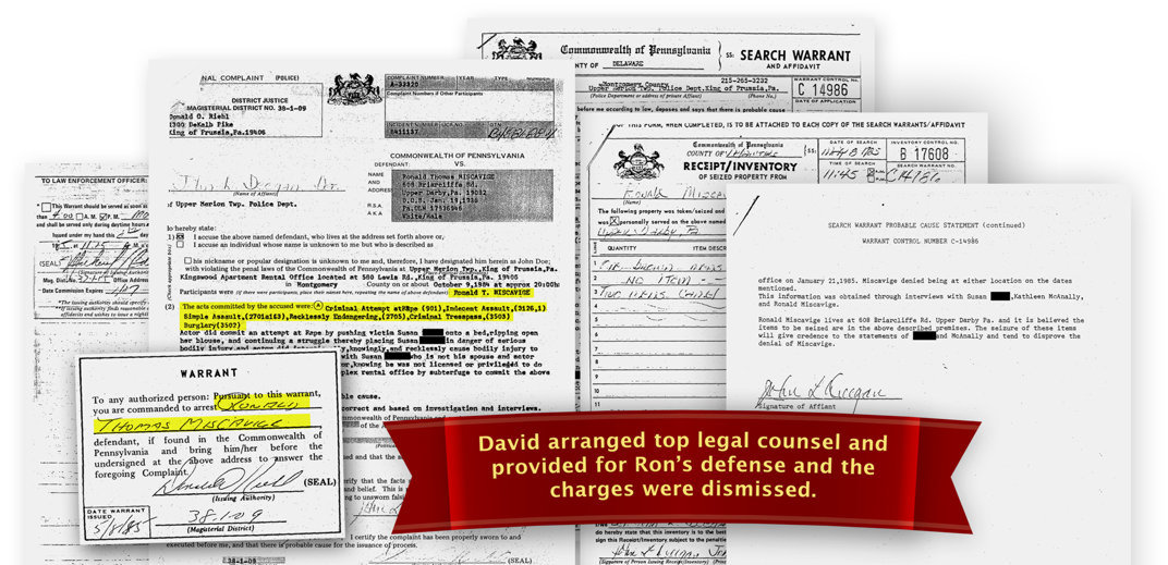 Ron was convinced he would be imprisoned (and then would be sodomized and found hanging in his cell). His son David is the person he turned to for help and, while thousands of miles away, David retained the best legal counsel in Philadelphia. Ron is a free man thanks to his son.