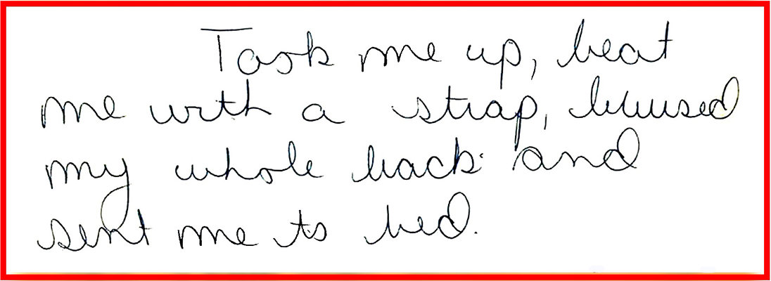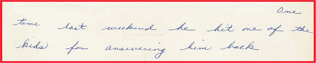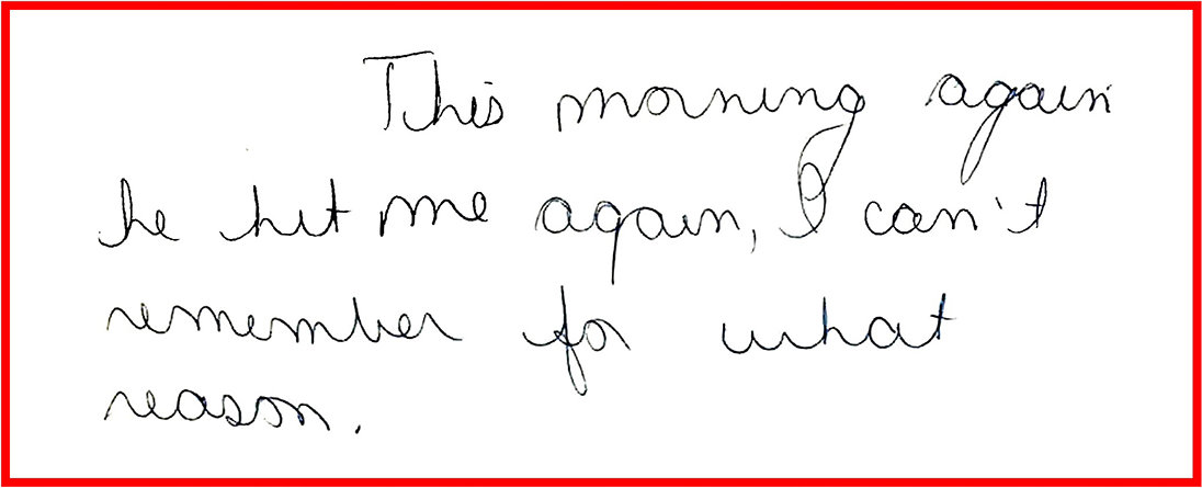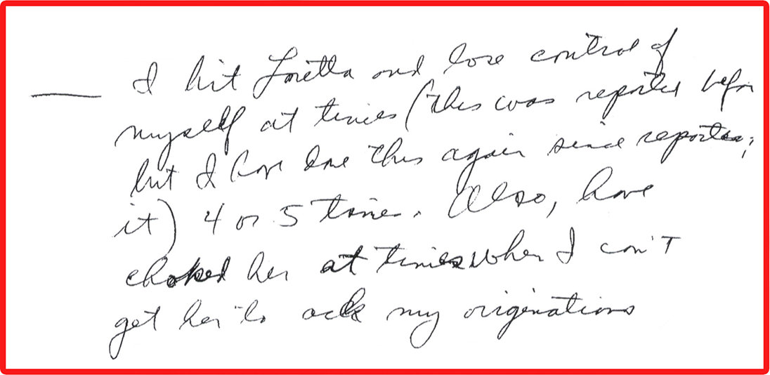 “I hit Loretta and lose control of myself at times (this was reported before but I have done this again since reporting it) 4 or 5 times. Also, have choked her at times when I can’t get her to ack [acknowledge] my originations [ideas].”