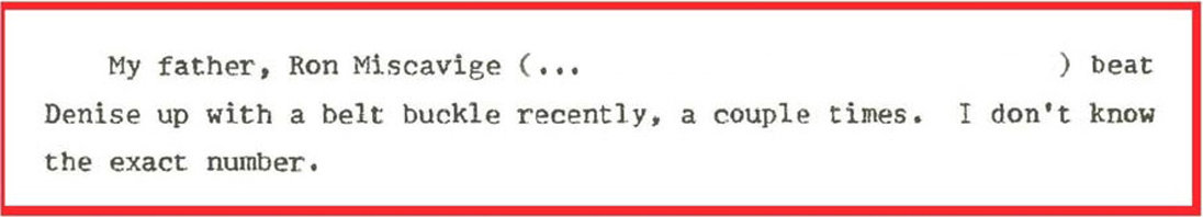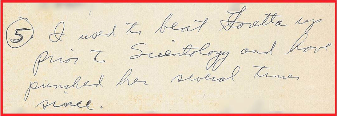 Ron Miscavige admitted to not only hitting but to choking his late wife. In a moment of introspection, on February 27, 1977, Ron authored a handwritten account as part of the family’s effort to deal with his violent behavior; behavior that erupted after his younger son, David, the family’s moral compass, left home to join the religious order. Ron wrote: