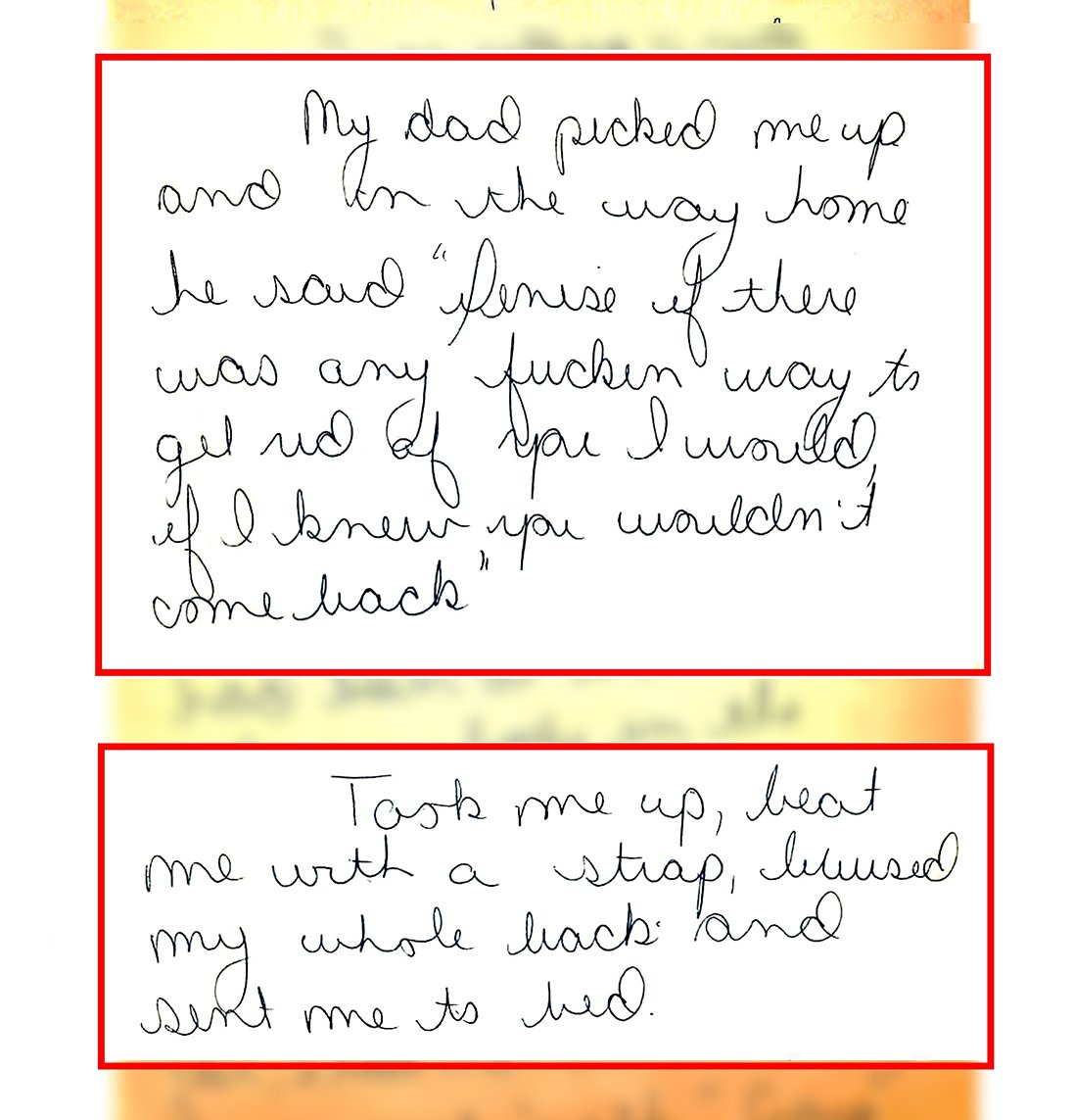 “My dad picked me up and on the way home he said ‘Denise if there was any f***en way to get rid of you I would if I knew you wouldn’t come back.’ Took me up, beat me with a strap, bruised my whole back and sent me to bed…This morning again he hit me again, I can’t remember for what reason… We are (I am) afraid my dad will hit us…”