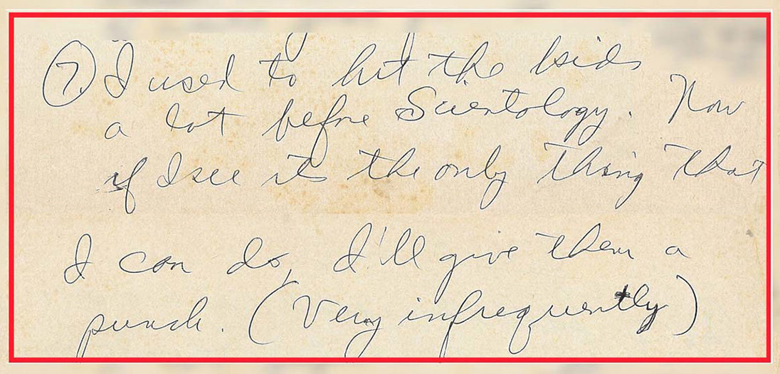 He also said to Megyn Kelly on the Fox News program The Kelly File that he never hit Loretta after Scientology. While it is true that before David left home to join the religious order he kept his father’s behavior in check, Ron’s own handwritten words from 1977 show he started hitting Loretta again after David departed, exposing as a baldfaced lie his spin today that he had stopped: