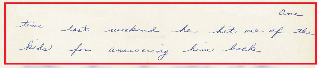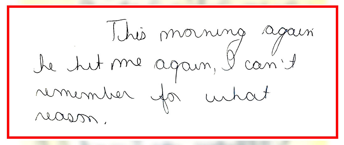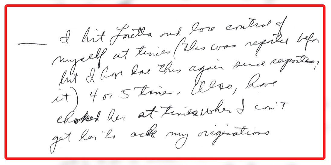 “I hit Loretta and lose control of myself at times (this was reported before but I have done this again since reporting it) 4 or 5 times. Also, have choked her at times when I can’t get her to ack [acknowledge] my originations [ideas].”