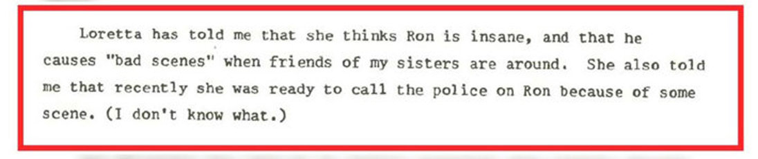 But the writings of Ron and his family from that period tell a darker, more sinister tale about his abuse, one far more violent that shows how badly his temper was out of control. Ron admits in those writings that he not only beat Loretta but also his own daughters.