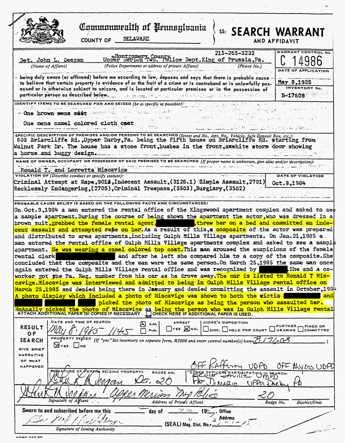 According to police documents, the witness at the Gulph Mills Village complex wrote down details about the car (a 4-door cream colored Honda Accord) and the license plate, which exactly matched Ron Miscavige’s car. When Detective Deegan of the Upper Merion Police interviewed Ron he admitted that a) it was his car, b) he was a salesman and had made business calls to the Kingswood apartments where the assault had occurred and c) that he was in the rental office of Gulph Mills Village apartments in late March.